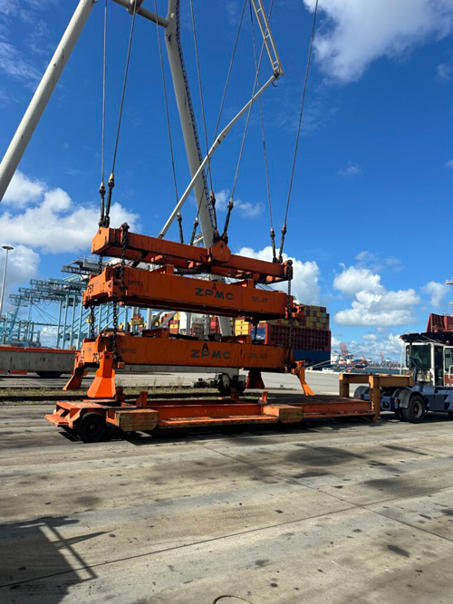 Defecte spreader loskoppelen van de automatic stack crane (ASC) en de vers nagekeken goede spreader er weer aan koppelen.